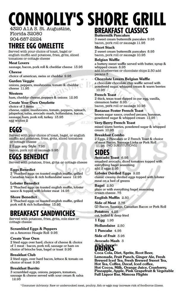 Located in beautiful Saint Augustine Beach, Connolly’s is a family-owned and operated restaurant named after the owners late Grandmother and proudly serving the community since 2019. We offer a wide variety of made-to-order breakfast and lunch dishes—served all day, every day—from 8 AM to 2 PM.